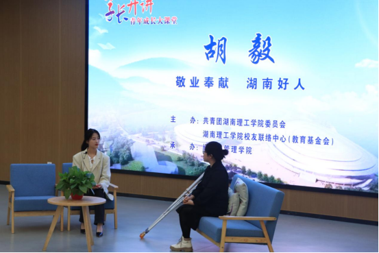课堂上,胡毅温柔而又坚定的话语赢得了现场师生的阵阵掌声。在讲述自己人生经历的过程中,胡毅身上所流露的积极乐观,所展现出来的湖南人那种“霸得蛮”的精神,都深深打动了现场的所有师生。在现场互动环节中,同学们纷围绕胡毅战胜困难的心态历程、自己当前的迷茫以及保持良好心态的秘诀等方面展开提问和交流。胡毅一一为大家详细解答,并鼓励所有同学,虽然生活中总会遇到各种难关,但是只有不断努力奋进,笑对生活,才能真正跳出自己的人生困境,迎接新的美好人生,为祖国和社会贡献力量。