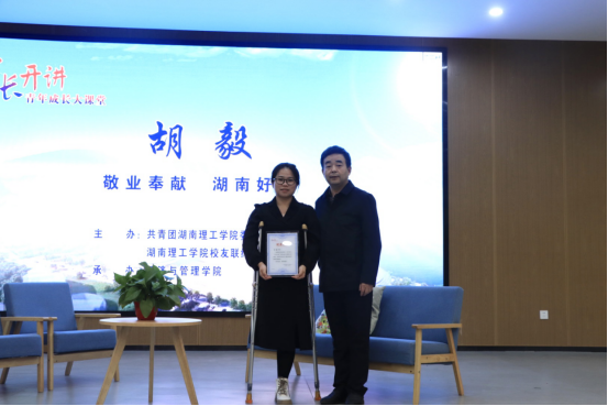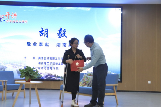 讲课结束后,校团委书记司念伟作了简短总结。司书记分享了胡毅带给他的“三重感动”:一是2013年胡毅截肢后返校后曾在公司作过一次演讲,当时在校宣传部工作的司书记被她的事迹深深打动;二是2023年暑假,司书记与员工办一行前往石潭坝小学看望胡毅时,被公司的简陋条件、胡毅的工作热情与小孩子的天真烂漫所感动;三是在此次大课堂上,进一步被胡毅的积极乐观与顽强坚毅的精神所感动。同时,司书记强调,青年员工应以胡毅为榜样,不断奋进,成长为可堪大用、可担重任的国家栋梁之才。随后,员工办主任梁峰为胡毅员工颁发“学长开讲”纪念证书,校团委书记司念伟代表公司为胡毅赠送定制的礼品邀请她常回母校看看。