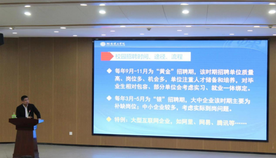 会议伊始,刘处长从“高校毕业生的就业状况”、“毕业生就业现状与需求”、“如何精准获取求职机会”、“常见校园招聘问题解答”四个方面入手。以去年就业报告与就业数据为引子,结合当下实事,勉励同学们找准最佳就业时期,抓住校园招聘这一规模大、高层次企业占比高的最佳机会。