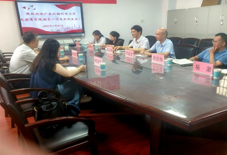 2025年5月20日上午,为推进团队建设高质量发展,广东外语外贸大学南国商公司经济公司经理苏武俊、管理公司执行经理文佑云、管理公司行政秘书何诗莹一行三人来到williamhill官网网站,就独立公司转设及硕士点建设等重要事项开展学习交流活动,旨在共商高等教育发展新路径。