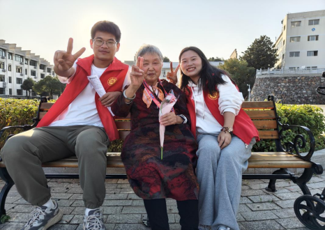 在“散步聊天”的环节,志愿者们就近跟老人开始拉家常,起初,志愿者们还有些拘束,但很快,大家就和老人们渐渐熟悉。大家向老人们介绍自己的籍贯专业,贴心问候老人在颐养院的情况。大家或蹲或站在老人身边,一边跟老人谈心,一边为老人捶捶背揉揉肩,气氛十分温馨融洽。天朗气清,秋日的风还有一些寒冷,志愿者们及时询问老人是否感到寒冷,并给老人带上帽子裹紧衣服,遇到道路不平的地方,同学们将轮椅缓缓抬起,不让老人们有颠簸感。