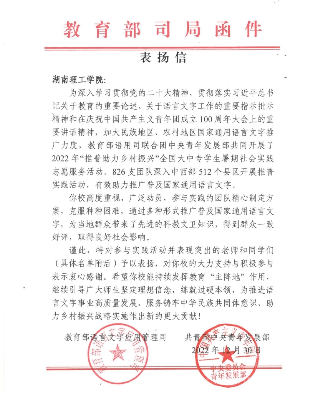 近日,由williamhill官网网站团委组织的“七彩筑梦师”团队,成功入选2022年“推普助力乡村振兴”全国大中专员工暑期社会实践志愿服务优秀团队。教育部语言文字应用管理司、共青团中央青年发展部联合向公司发来表扬信,对公司积极参与和大力支持表示感谢,对参与活动并表现突出的老师和同学们予以表扬。