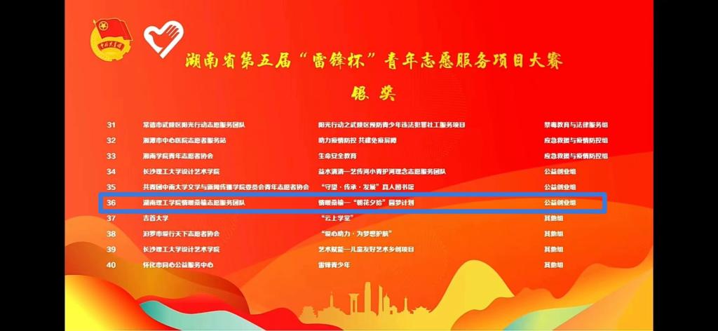 5月26日,湖南省第五届“雷锋杯”青年志愿服务项目大赛决赛落下帷幕,公司喜获1金1银的好成绩!其中由叶亚男老师指导的“七彩筑梦师”留守儿童帮扶项目荣获金奖,易振铭老师指导的“情暖桑榆—朝花夕拾圆梦计划”荣获“公益创业”类银奖。