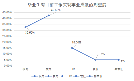根据调查数据分析,将近75%的调查毕业生对自己的工作能实现自身事业成就的期望程度高,仅5%的调查毕业生认为自己不能用本工作实现事业成就,具有非常低的期望程度。