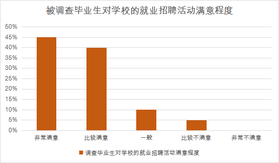 透过数据可见,被调查毕业生对公司举行的就业招聘活动满意程度都趋于非常满意、比较满意,而非常不满意的权重为0,从中显示出毕业生对这类招聘活动的兴趣程度较高,公司可以借此多举行类似的就业招聘活动来吸引毕业生参与,促进就业。