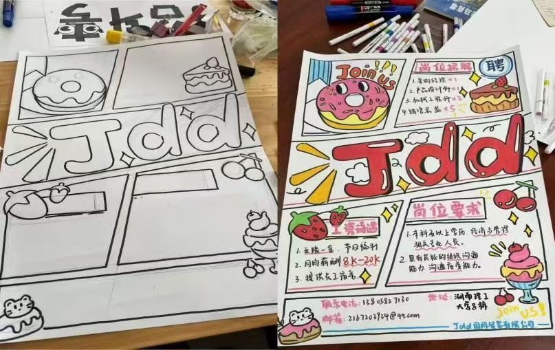 海报设计环节,各实训小组充分发挥团队协作能力,深入研究模拟企业的业务特点与岗位需求,依托仿真企业运营场景,围绕企业文化内核与发展规划,精心设计制作招聘海报,聚焦招募复合型人才,助力模拟企业完成高质量的“人才储备”,同时提升小组成员的实战策划与设计能力。