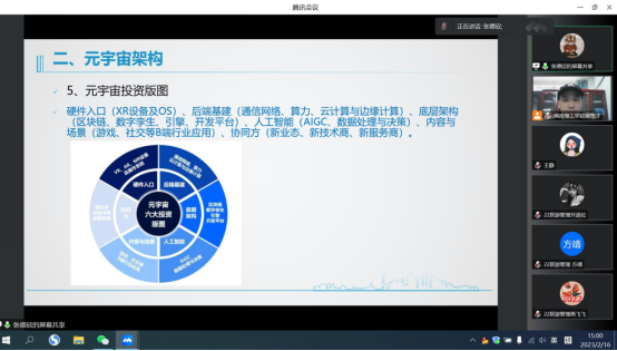 张德欣教授首先从“元宇宙发展史”说起,分别介绍了各国学者对于元宇宙的定义,并分析得出根据国内外统计,元宇宙的经济价值将会超过80万亿美元。他重点分析了我国国内元宇宙发展现状,从最开始的字节跳动公司,百度的“希壤”计划,一些高校开设“元宇宙科学”专业,各省市政府报告中强调人工智能和元宇宙,到2022年9月中国电子商会元宇宙专业委员会的成立,都充分说明元宇宙已经逐步全面渗入我们的工作及生活。
