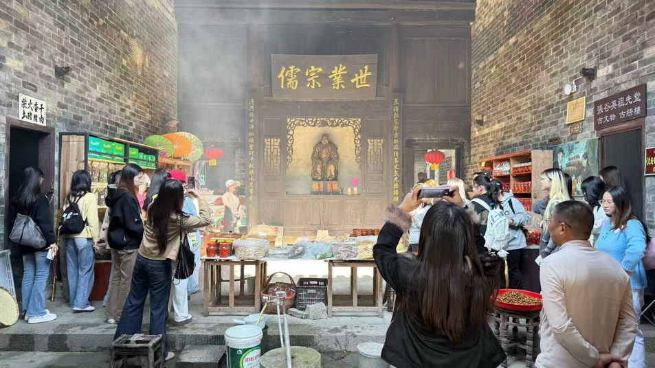 11月16日上午,师生一行抵达张谷英村后,首先在村文化广场开展了简短的调研启动仪式。随后,在当地文化学者的引导下,先后参观了张谷英村景区古建筑群核心区域,包括当大门、王家塅、上新屋等明清民居院落,详细了解了“四水归堂”的建筑智慧、“耕读传家”的宗族传统以及村落的历史演变脉络。在张谷英村民俗文化展览馆,通过实物陈列、影像资料和互动体验,师生们深入感受了湘绣、竹编、古法酿酒等非物质文化遗产的独特魅力。